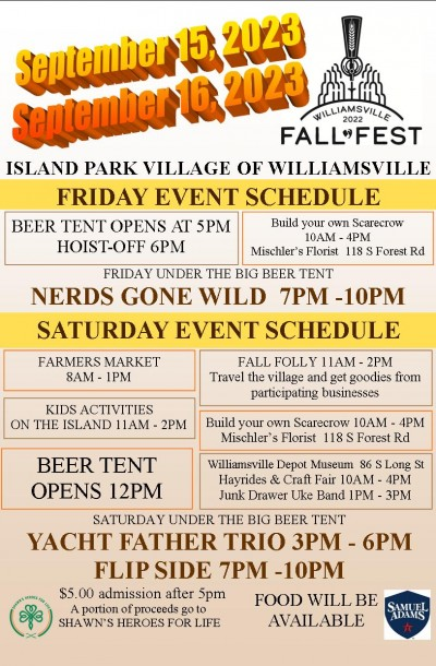 Fall Festival Village of Williamsville. Friday September 15 Island Park Beer Tent opens a 5pm, Live music 7-10pm Nerds Gone Wild. Saturday September 16 Farmers Market 8am-1pm 5583 Main St, Kids activities 11am-2pm on Island Park and also village wide shopping with treats for the kinds, Build your own scarecrow Mischler's Florist 118 S Forest Rd 10am-4pm, Williamsville Depot Museum Hayrides and Craft Fair 10am-4pm Beer Tent on Island Park opens at 12pm Live music 3-6pm Yacht Father Trio 7-10pm Flip Side. $5.00 admission after 5pm. Food will be available