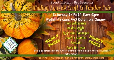Come on out to support your local small businesses from 11am-3pm at the Polish Falcons, 445 Columbia, Depew. We have some fabulous and unique crafters as well as some of your favorite vendors too! FREE ADMISSION. HOURLY PRIZES! BASKET RAFFLE! $5/5 mini massages! Goodies! Psychic readings! Cash Bar at 1pm! There's something for everyone! You don't need to be present to win the Basket Raffle. Bring donations for The Buffalo Animal Shelter for extra tickets/discounts. Bookings: contact Maria, eventpreneurpro@gmail.com.