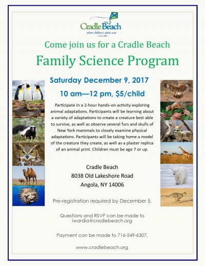 Participate in a 2-hour hands-on activity exploring animal adaptations. Participants will be learning about a variety of adaptations to create a creature best able to survive, as well as observe several furs and skulls of New York mammals to closely examine physical adaptations. Participants will be taking home a model of the creature they create, as well as a plaster replica of an animal print.
