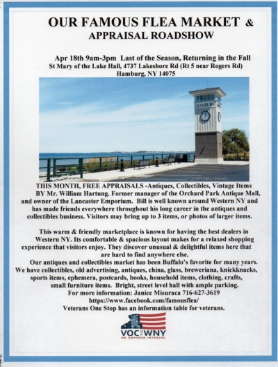 Treasure hunt for collectibles, Buffalo memorabilia, old advertising, antiques, china, glass, breweriana, knickknacks, sports items, ephemera, postcards, books, household items, clothing, crafts, small furniture items, and more. Veterans One Spot will have an information table. They assist veterans with their needs. Free admission. Bright, street level hall with ample parking. Free visitors parking in front of the hall in the lot on Lake Shore Road and behind the church, in the lot on Kennison and Norton