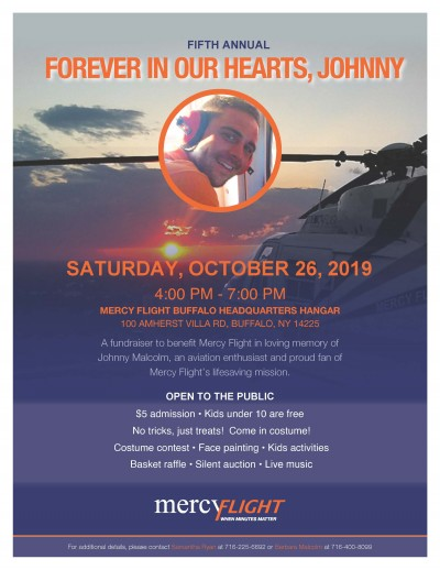 A fundraiser to benefit Mercy Flight in loving memory of Johnny Malcolm, an aviation enthusiast and a proud fan of Mercy Flight's Lifesaving Mission. This event is open to the public with $5 admission and children under 10 are free! Costumes are encouraged for the costume contest. There will also be face painting, silent auctions, basket raffles, kids activities, live music, and more!