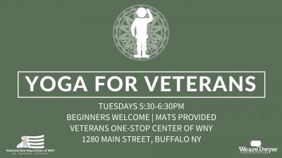 The We are Dwyer Peer Support Program of the Veterans One-stop Center of WNY invites all veterans and their adult family members and friends to attend a free weekly yoga class taught by a certified yoga instructor. Class is held at the Veterans One-stop Center of WNY at 1280 Main Street in Buffalo, NY from 5:30 PM- 6:30 PM every Tuesday! Mats are provided as well as blocks at a first come first served basis.