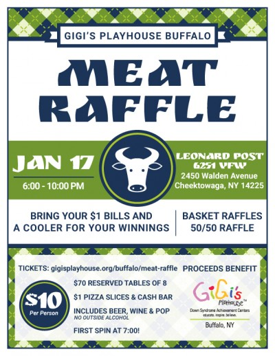 IT'S BACK!! Join us for the 2nd Annual GiGi's Playhouse Buffalo Meat Raffle! Held at the Leonard Post 6251 VFW in Cheektowaga, we'll have the main event (of course), as well as basket raffles, big ticket raffles, and a 50/50!
