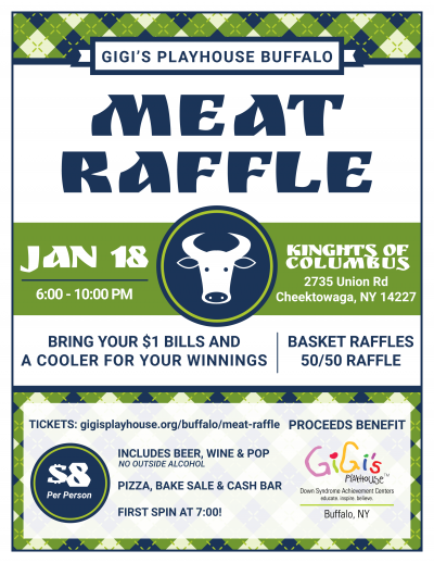 Join us for the GiGi's Playhouse Buffalo Meat Raffle! Held at the Knights of Columbus hall in Cheektowaga, we'll have the main event (of course), as well as basket raffles, a 50/50, and a bake sale!