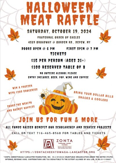 Zonta Cheektowaga-Lancaster Foundation is sponsoring a Halloween MEAT RAFFLE on Saturday, October 19 at the Fraternal Order of Eagles, 4569 Broadway @ Borden Rd., Depew NY 14043. Doors open at 6:00 PM, with 1st spin at 7:00 PM. Tickets are $15.00 per person with a pre-sale reserved table of 8 for only $100. Admission ticket includes beer, pop and wine. No outside alcohol is allowed. In addition to the MEAT RAFFLE, there will be a BASKET/GIFT CARD RAFFLE, a split club drawing, and a high value item raffle. Those items will include a 5 cubic ft freezer with a $200 gift card, a golf foursome round with golf cart, Lion King tickets, overnight hotel stays, 43 inch tv and more!