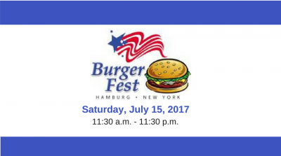 Join us on Saturday, July 15 from 11:30 a.m.-11:30 p.m. for the 33rd annual BurgerFest celebrating Hamburg, the birthplace of the burger! It features food from local restaurants and food trucks; live music on the Wegmans Main Stage from Elvis tribute artist Terry Buchwald, rock ‘n roll with Widow Maker, and Buffalo’s premiere party band, Hit N Run; Mike Margerum & the Nickel City Road Show; Magic on Main Street (dance, martial arts, musical, and cheerleading performances by local youth); the KeyBank Classic Car Show; the Northwest Bank Kids Space (arts and crafts for kids); a fine arts and crafts show; and the Labatt beer tent. The annual Hamburg Character Council 5K Race precedes the event at 9:30 a.m. that day. BurgerFest is presented by four service clubs in Hamburg, and proceeds benefit the community. The event takes place along Main and Buffalo Streets in Hamburg. Food tickets are 50 cents per ticket.