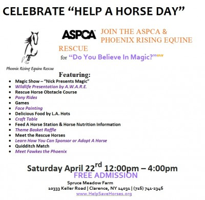Join the ASPCA and Phoenix Rising Equine Rescue Help the horses . Admission is free . We will have a Magic Show , wildlife presentations, pony rides, games. face painting, Theme basket raffle, a horse feed station and much much more. Get up close and personal with all the rescue horses ! This is a 501c3 organization .