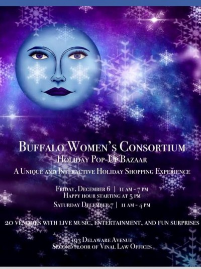 Buffalo Women’s Consortium will host their inaugural Holiday Pop-Up Bazaar the first weekend in December. The Bazaar will feature over 20 vendors selling unique handmade artisan goods including jewelry, hand-woven baskets, original artwork, all-natural soaps and candles and vintage clothing & accessories. Wellness providers and healers will offer opportunities to experience their services.
