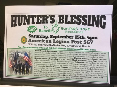 Sons of the Orchard Park American Legion are sponsoring "Hunter's Blessing" to benefit Hunter's Hope and Bless Hunters for the 2018 Hunting Season.