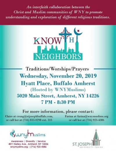 WNY Muslims and St. Joseph University Parish are sponsoring the interfaith effort called “Know Thy Neighbor” (knowthyneighbors.org #get2KTN), which was created from the perspective of conversing about religious articles of faith, worship, traditions, intentions and sacred texts of both faiths. The topic of conversation will beTraditions/Worship/Prayers. Panelists, and guests will share their knowledge of Christian and Muslim faiths for the purpose of educating, finding commonality and joining in shared projects of good works and charity that benefit our community. This is a free event. (Refreshments will follow).