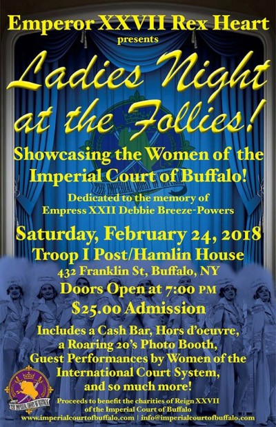Emperor XXVII Rex Heart presents LADIES NIGHT AT THE FOLLIES! Showcasing the Women of the Imperial Court of Buffalo! Dedicated to the memory of Empress XXII Debbie Breeze-Powers
