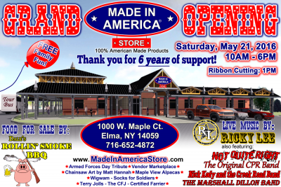 On Saturday, May 21st, 2016, The Made In America Store will celebrate their biggest expansion since opening in 2010. The Ribbon Cutting will kick off the Grand Opening at 1000 West Maple Court in Elma, NY 14059. This event will feature live music, giveaways, food vendors, Meet & Greets with some of biggest USA made vendors, and much more.