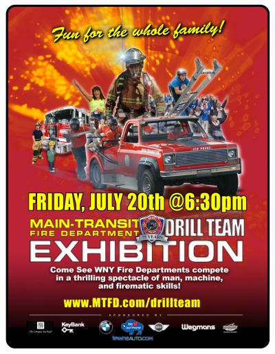 Friday, July 21st 2017 starting at 6:30pm, the Main-Transit Fire Department will host fire departments from across WNY to compete in a thrilling spectacle of man, machine and firematic skill. This event is open to the public with gates opening at 5:00pm on the grounds of the fire house: 6777 Main Street, Amherst, NY. Tickets are $5 and children under 10 are free. Live music, a bounce house and food & refreshments will also be available. All proceeds to benefit the Main Transit Fire Department, for information, E-mail Tickets@mtfd.com or visit NYSDrillteams.com.