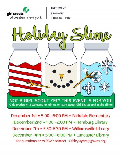 Not a Girl Scout? Join us for this FREE craft event! Girls in grades k-12 are welcome to attend learn more about what being a Girl Scout means AND make some holiday-themed slime!