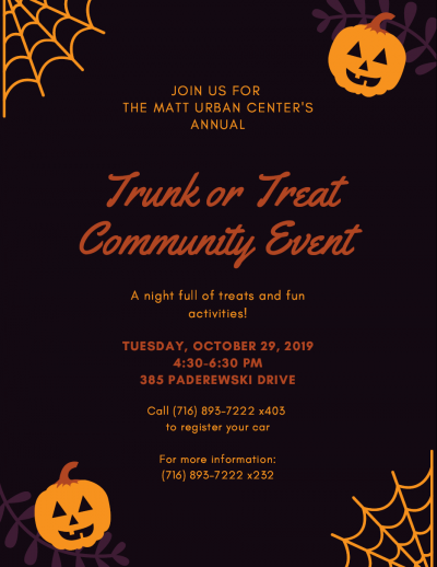 If you would like to register your car to hand out candy, please contact Danyel Sease at (716) 893-7222 x403 or dsease@urbanctr.org. If you are interested in donating candy, cider or donuts for the event, or would simply like more information, please contact Sarah Maurer at (716) 893-7222 x232 or smaurer@urbanctr.org.
