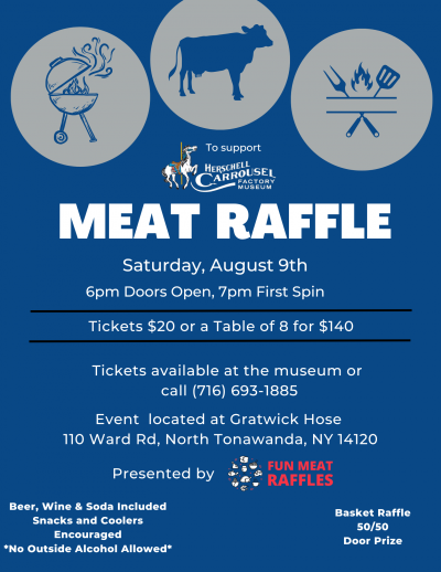 Join the museum for a Meat Raffle Fundraiser on Saturday June 1st at Gratwick Hose 110 Ward Road, North Tonawanda. The event includes the meat raffle, a basket raffle, a 50/50, and a door prize. $20 ticket per person gets your seat, beer, wine, or soda for the evening and a chance at the door prize. (Meat tickets, raffle tickets and 50/50 tickets are sold separately). Come alone or bring friends and purchase your own table for $140! Bringing your own snacks and coolers are encouraged, but no outside alcohol is permitted. Doors open at 6pm, the first drawing is at 7pm.