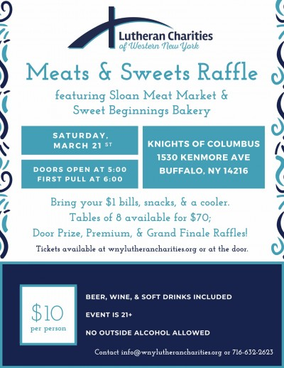 To benefits the local charities supported by Lutheran Chairities of WNY. Featuring meats from Sloan Meat Market and sweets from Sweet Beginnings Bakery. Beer, wine and soft drinks included. 21+ only. No outside alcohol allowed. Tickets available at www.wnylutherancharities.org or at the door. $10 per person or table of 8 for $70.