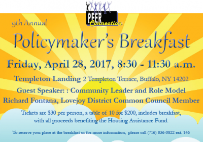 Mental Health Peer Connection will be hosting it's 9th Annual Breakfast with the Policymaker on Friday, April 28, 2017 from 8:30am-11:30am. We have the privilege to have guest speaker, Richard Fontana, Lovejoy District Common Council Member, join us to speak about disability related issues in Erie County.