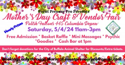 Come on out to support your local small businesses from 11am-3pm at the Polish Falcons, 445 Columbia, Depew. We have some fabulous and unique crafters as well as some of your favorite vendors too! FREE ADMISSION. HOURLY PRIZES! BASKET RAFFLE! $5/5 mini massages! Goodies! Psychic readings! Cash Bar at 1pm! There's something for everyone! You don't need to be present to win the Basket Raffle. Bring donations for The Buffalo Animal Shelter for extra tickets/discounts. Bookings: contact Maria, eventpreneurpro@gmail.com.