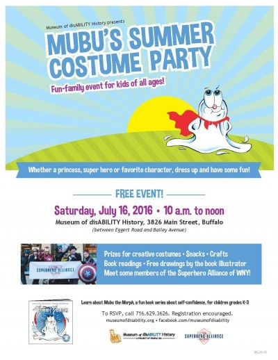 Mubu's summer costume party will be hosted by the Muesum of Disability History. Kids can become their favorite princess, super hero or cartoon character. Prizes will be awarded for best costume including a family category. The event includes snacks book readings free drawings by the book illustrato. Kids can meet and take pictures with members of The Super Hero Alliance of Western New York. Kids can also learn about Mubu the Morph. Which is a book series that will be featured at the event. This is a fun book series specifically for children grades K- 3 about self confidence. The featured book series is created and written by Stephen Nawontiak and illustrated by Jeffery Scott Perdziak. This is a fun and educational event for children and adults, get your best costume and join the fun!