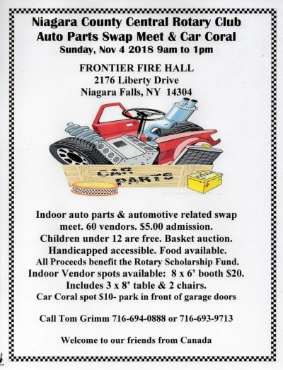 This popular auto parts & automotive related swap meet has a huge following and has grown every year. Indoors. 60 vendors. Includes outdoor car corral. $5.00 admission. Children under 12 are free. Basket auction. Handicapped accessible. Food available. All Proceeds benefit the Rotary Scholarship Fund. Vendor spots available. 8 x 6 Booth, with one 8’ table and two chairs $20. Car Coral spot $10-park in front of garage doors. Call Tom Grimm 716-694-0888 or 716-693-9713. Welcome to Our Friends from Canada