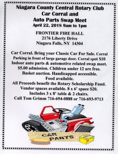 This popular auto parts & automotive related swap meet has a huge following and has grown every year. Indoors. 60 vendors. Includes outdoor car corral. $5.00 admission. Children under 12 are free. Basket auction. Handicapped accessible. Food available. All Proceeds benefit the Rotary Scholarship Fund. Vendor spaces available. Call Tom Grimm 716-694-0888 or 716-693-9713.