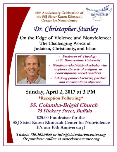 All three of the Abrahamic religions—Judaism, Christianity, and Islam—have followers who have cited their sacred texts to justify both horrific acts of violence and heroic efforts for peace. How is it possible that people can come to such opposite conclusions about the teachings of their Scriptures on such a vital topic? This presentation will examine some of the key verses used by Jews, Christians, and Muslims to support their beliefs about violence and nonviolence and identify some of the benefits and dangers of using such texts to guide our lives today. The program will include a celebration of the 10th anniversary of the SSJ Sister Karen Klimczak Center for Nonviolence and a reception will follow. Tickets are $25.00 and can be purchased online at sisterkarencenter.org or at the door. Call 362.9688 for more information.
