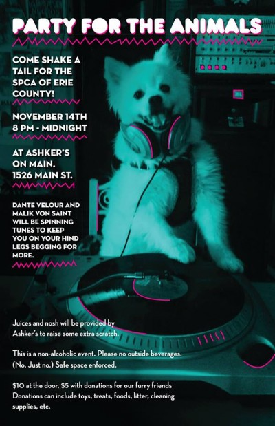 Come shake a tail and raise some scratch for our furry friends at the new Ashker's location on Main Street at W. Ferry. Dante Velour and Malik Von Saint will be spinning tune to keep you on your hind legs begging for more. Juices and nosh will be provided by Ashker's.