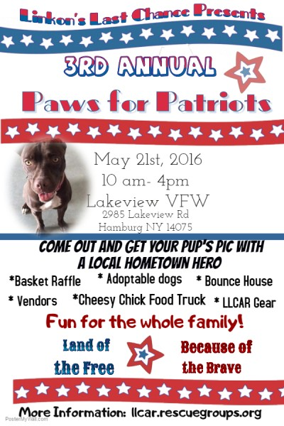 Linkon's Last Chance animal Rescue is hosting its 3rd annual paws for patriots fundraiser. This is a Free Family/dog friendly event. We will have Vendors, Bounce house, , food truck, children activities, basket raffles and much much more.