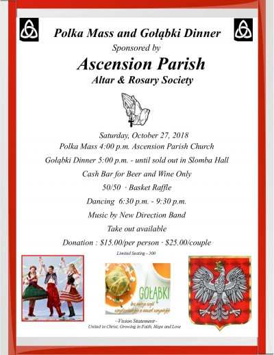 Ascension Parish Altar and Rosary Society is sponsoring a Polka Mass and Golabki Dinner. Music provided by New Direction Band. 50/50 and Basket Raffles. Cash bar with beer and wine only. Tickets are available in Parish Office 585-343-1796 or online at https://ascensionrcc.weshareonline.org