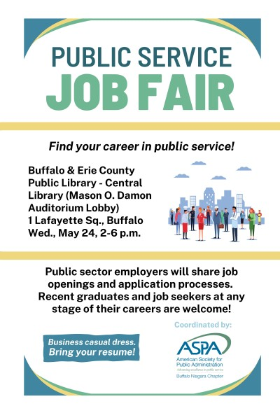 A variety of public sector employers will discuss job openings and application processes for positions ranging from entry-level to experienced. More information about specific employers at the Public Service Job Fair will be available closer to the event date on the ASPA Buffalo Niagara Chapter website and the Chapter’s social media channels.