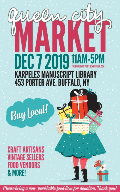The eighth annual Queen City Market will be held on Saturday December 7th, 2019 from 11am to 5pm at the Karpeles Manuscript Library Museum at 453 Porter Avenue in Buffalo, NY. This event will feature 50+ local vendors, selling either handmade or vintage items. Each vendor was handpicked to guarantee a wide selection of goods–including jewelry, ceramics, vintage clothing and housewares, local foods, and much more. This is a free event and is open to the public, so please pass it on! We want this to be a day that promotes our city and the people in it.