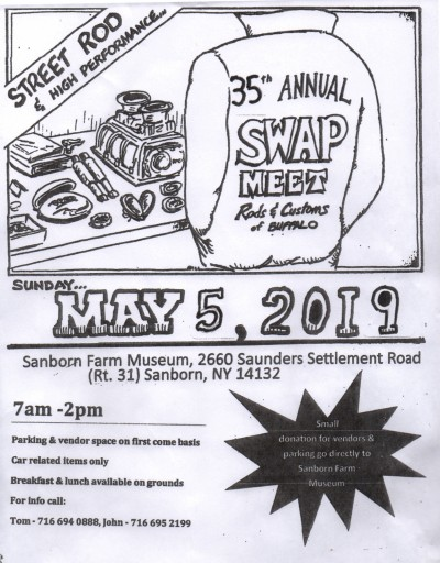 35th Annual swap meet featuring automotive items and parts old and new. Includes Car Corral. The Club is devoted to the restoration and preservation of hot rods & customs in the style of the late 40s to early 60s. Gates open at 7am. Parking and vendor space on first come, first serve basis. Auto related items only. RAIN OR SHINE. Breakfast and Lunch available on the grounds. Small donation for vendors and parking goes to the Sanborn Farm Museum. For information, call John 716-628-6786 or Tom 716-694-0888 Grandmapat1963@gmail.com