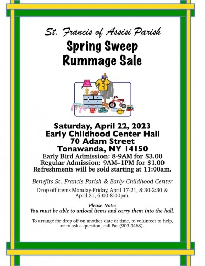 St. Francis of Assisi is having a Rummage Sale of gently used items on Saturday, April 22 at 70 Adam Street in the City of Tonawanda. Early Birds will be admitted for $3.00 beginning at 8 am ; regular admission starts at 9 am for $1.00. The sale ends at 1 pm. Hot dogs and soda will be sold starting at 11 am. Proceeds benefit St. Francis of Assisi Parish and Early Childhood Center.All are welcome.