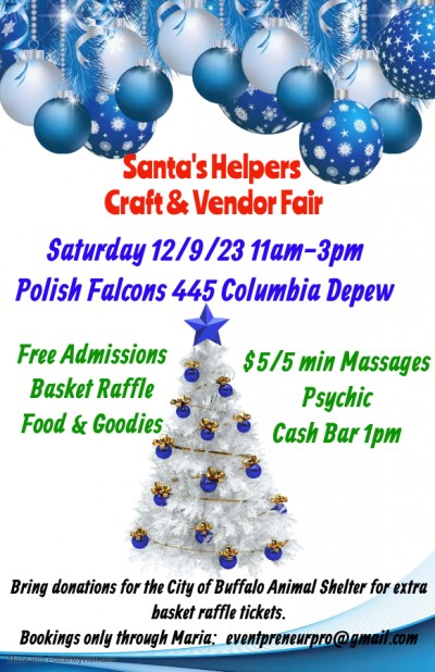 Come on out to support your local small businesses. We have some fabulous and unique crafters as well as some of your favorite vendors. There's something for everyone! Basket Raffle! $5/5 min mini massages! Psychic! Goodies! Cash Bar at 1! Bring donations for the City of Buffalo Animal Shelter for extra tickets after initial purchase. No need to be present to win. Bookings only through Maria at eventpreneurpro@gmail.com
