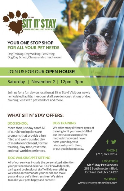 Sit n' Stay offers dog training, dog walking, pet sitting, dog day school, classes and so much more! If you have questions, come to the Open House for answers!