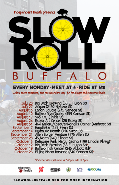 Slow Roll is a group bicycle ride that meets every Monday night and has expanded into a Global network of community rides. Each week we meet at different venues and take a unique route throughout the city, including all the major and minor neighborhoods that we are so proud of. Slow Roll is for everyone; all ages, all skill levels and every type of bike is welcome. Bicycle through Buffalo with 500 of your new best friends! Our slow pace keeps the group safe and gives riders a unique perspective of our great city and its neighborhoods. Minors under 18 must be accompanied by a parent/guardian