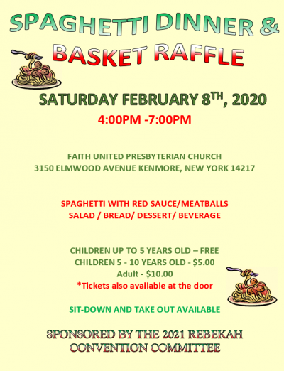 Spaghetti Dinner AND Basket Raffle at the Faith United Presbyterian Church at 3150 Elmwood Avenue Kenmore New York 14217 on Saturday, February 8, 2020, from 4:00pm -7:00pm. Spaghetti with red sauce/meatballs, salad, bread, dessert and beverages.