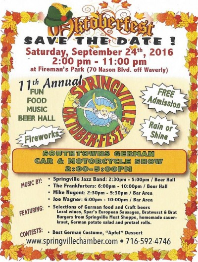 The Springville Area Chamber of Commerce 11th Annual Oktoberfest will take place on Saturday, September 24th from 2-11pm at the Springville Fireman’s Park, 70 Nason Blvd. just off Waverly Street.