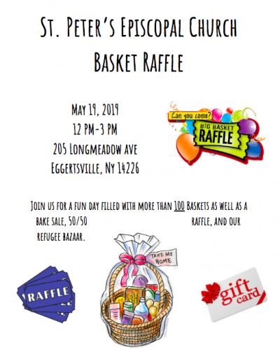Join us for a fun basket raffle to support our youth ministries. We will have more than 100 baskets, as well as a 50/50 raffle, bake sale, and a refugee bazaar.