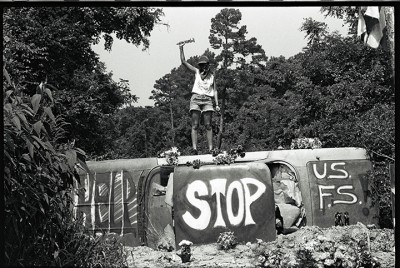 The exhibit documents the efforts of people on the front lines of campaigns to stop social and ecological injustice. All of the photographs were shot with film.