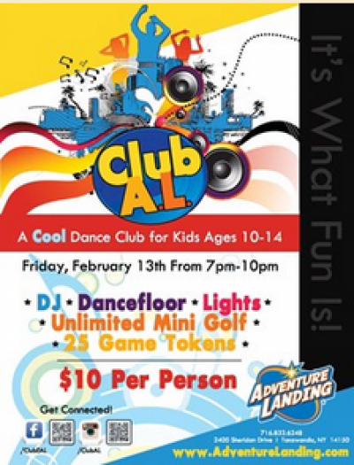 Adventure Landing will host Teen Night at Club A. L., a cool dance club for kids ages 10 to 14. Security will be on site to ensure a safe and fun night. Enjoy a DJ spinning live music, lights, a dance floor, 25 arcade tokens per person plus unlimited mini golf on the Frontier Course (mini golf is weather permitting). The cost is only $10 per person. Adventure Landing is located at 2400 Sheridan Drive in Tonawanda, NY. For more details, please call 716-832-6248, or visit our website, www.adventurelanding.com .