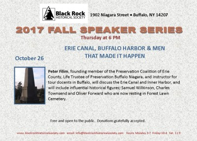 Peter Filim, founding member of the Preservation Coalition of Erie County, Life Trustee of Preservation Buffalo Niagara, and instructor for tour docents in Buffalo, will discuss the Erie Canal and Inner Harbor, and will include influential historical figures; Samuel Wilkinson, Charles Townsend and Oliver Forward who are now resting in Forest Lawn Cemetery.