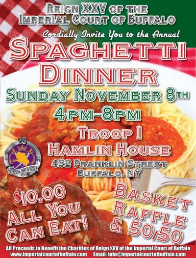 Who's ready for an all-you-can-eat spaghetti and meatball dinner? The Imperial Court of Buffalo and its community will be hosting dinner for a great cause. Dinner includes salad, bread, spghettii, and a selection of desserts. There will also be a 50-50 raffle and basket raffles. All proceeds go to the designated charities of Reign 25 of the Imperial Court of Buffalo. A cash bar will be available
