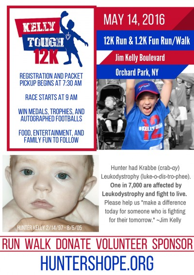 1 Bills Drive Orchard Park, NY 14127Runners and walkers - join Jim Kelly and Hunter’s Hope for the second annual The Kelly Tough. The 12K Run and 1.2K Fun Run/Walk will begin at 9:00am on Jim Kelly Boulevard, near Ralph Wilson Stadium in Orchard Park. The run and walk are immediately followed by a post-race celebration with food, family-friendly entertainment, and an awards ceremony.