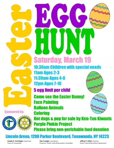 Town of Tonawanda Youth, Parks & Recreation and Rotary Club of Kenmore are putting on their 33rd Annual Easter Egg Hunt on Saturday, March 19. The event, which attracts about 400-500 children, will be held inside Lincoln Arena, located at 1200 Parker Boulevard. Activities will include an egg hunt with a 5 egg limit per child, face painting, balloon animals, coloring, and a chance to see the Easter bunny. Non-perishable food items will be collected on-site to benefit our local food pantry. Ken-Ton Kiwanis will be present selling hot dogs, pop, and giant coloring books. Rotary Club of Kenmore will be collecting donations and painting fingers for the Purple Pinkie Project to help eradicate Polio.