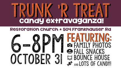 Bring the kiddos in costume down to our annual Trunk Or Treat! We'll have a family-friendly environment set up with fall snacks, family photo booth, and more than 20 spots with candy for the kids. Best of all, everything is completely free! We hope to see you there!