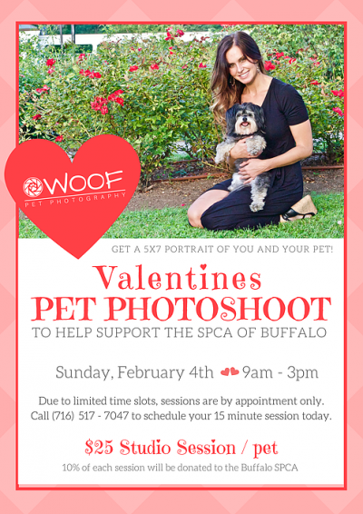Cost is $25 per pet. 1 pet, with 10% of all proceeds donated to the SPCA of Buffalo. Cash or check accepted. 5 carefully selected photos will emailed to you the week after the photo shoot. Select your favorite and the photographer will edit, print and mail it to you just in time for Valentine’s Day.