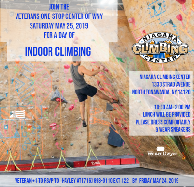 The Veterans One-Stop Center of WNY invites veterans plus 1 guest to attend a free indoor climbing event on Saturday May 25, 2019. Participants will meet at 10:30am to learn harness climbing safety and from there will partner up to take on Niagara Climbing Center's indoor course.