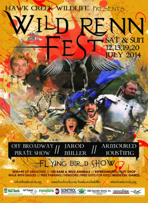 Come join Hawk Creek Wildlife Center for a medieval spectacle sure to enchant you, your family, and friends! The annual WILD RENN FEST on the weekends of July 18, 19, 25, and 26, 2014 from 11:00am-4:00pm is highlighted by nationally renowned Jarod Miller of Animal Exploration, the brave knights of Paragon Jousting, the aerial acrobatics of free flying birds during Quest for a Crew! flying bird show and the off-Broadway show, The Greatest Pirate Story Never Told! Each event day is brimming with excitement as the diversity of wildlife is celebrated with medieval flair! Television celebrity Jarod Miller will share his eclectic collection of wildlife from around the world during his daily show and meet and greet session. Witness thrilling full-armored combat as the professional jousters of Paragon Jousting duel on horseback for their rights to the fair maidens of the land – July 25 & 26 ONLY!